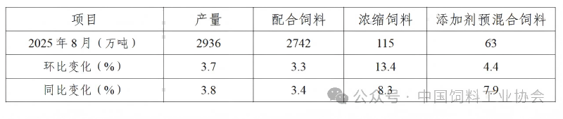 2025年8月,全国工业饲料产量2936万吨,环比增长3.7%,同比增长3.8%。其中,配合饲料、浓缩饲料、添加剂预混合饲料同比分别增长3.4%、8.3%、7.9%。饲料产品出厂价格同比呈下降趋势,畜禽配合饲料、浓缩饲料出厂价格环比以增为主,添加剂预混合饲料出厂价格小幅下降。饲料企业生产的配合饲料中玉米用量占比为32.9%,配合饲料和浓缩饲料中豆粕用量占比为14.3%。